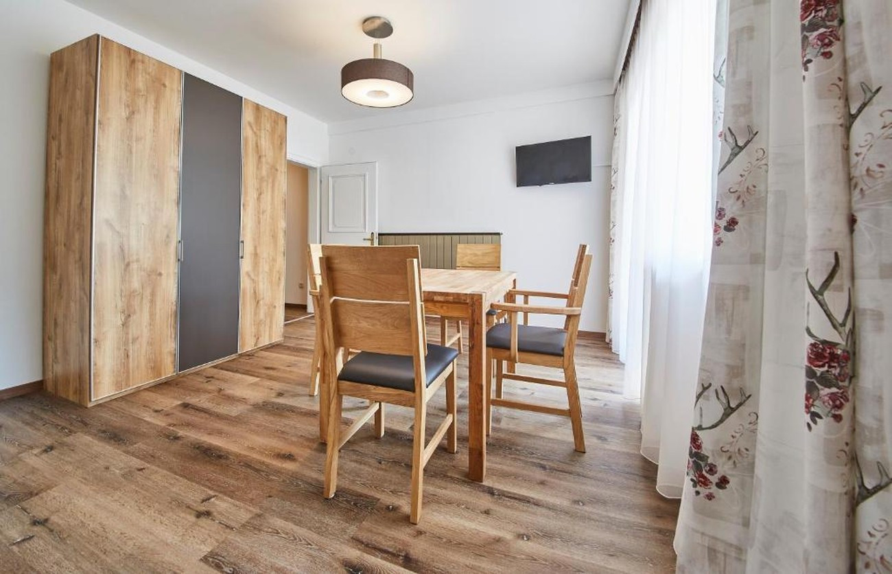 Eines der Schlafzimmer dient gleichzeitig als Essbereich. In einem kleinen, angrenzenden Raum befindet sich die kompakte Küche, ausgestattet mit Kochplatten, Kühlschrank und Kaffeemaschine sowie allem Notwendigen für die Selbstversorgung im Urlaub. In den Badezimmern stehen Haartrockner zur Verfügung. Die Einrichtung ist schlicht, funktional und gepflegt – perfekt für einen aktiven Aufenthalt in den Bergen.